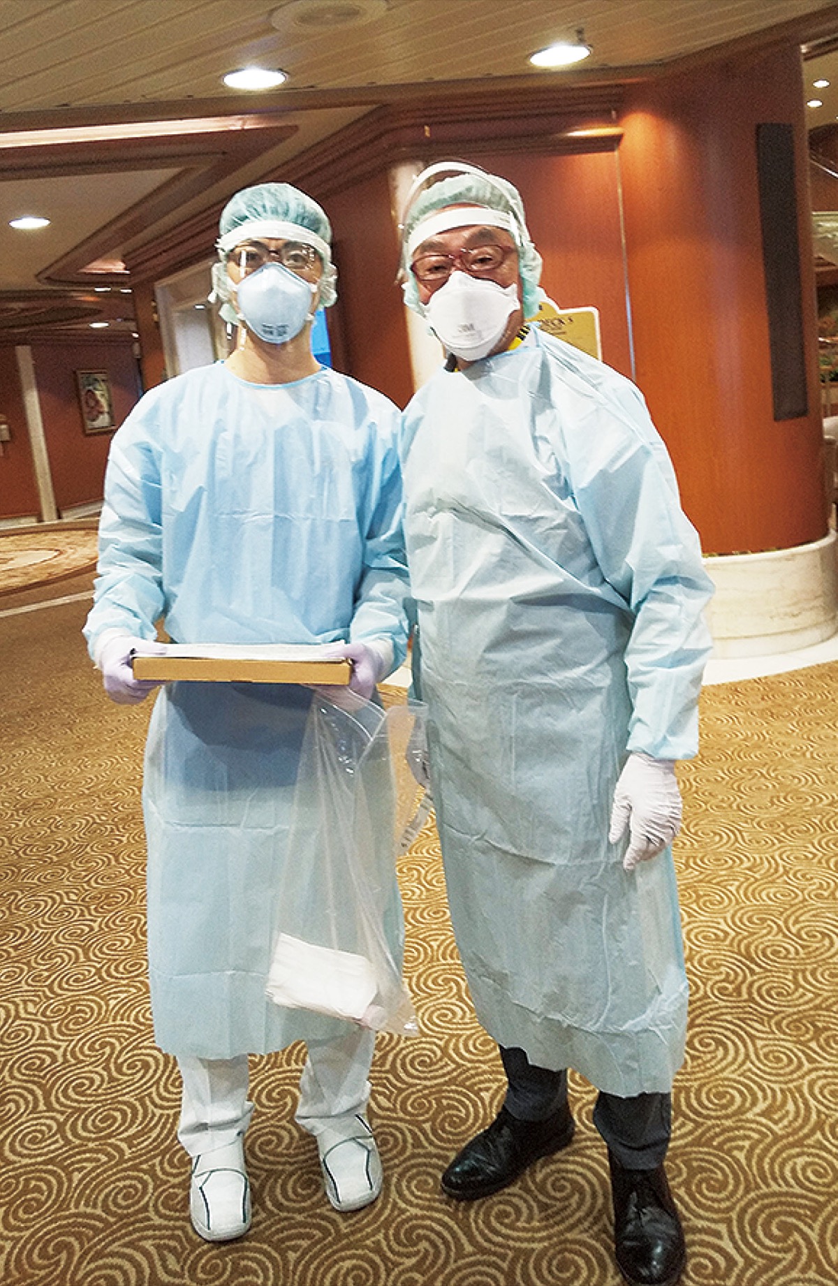 2日目からは乗客も問診。下船が始まり活動を打ち切った19日までにJMATとして全乗員、乗客に声をかけることができた。日本感染症学会の指導のもと正しい着脱方法でガウンやマスク、手袋など防護具を使用。医師1人が問診するのは原則半日で、希望者は感染検査を受けるなど対策を徹底した。14日に乗船した岡野会長は「半日間、緊張感を保って活動した。新型コロナは要注意だが、正しい知識で対応すべき」と語った。