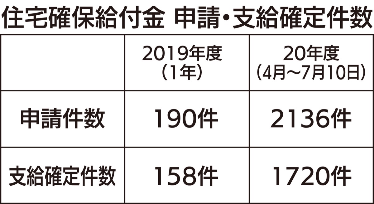 2020年4月から7月10日までの申請件数は2136件、支給決定件数は1720件となった。昨年度1年間の申請件数190件、支給決定件数158件と比べ、3カ月間で昨年1年間の10倍以上となっている。