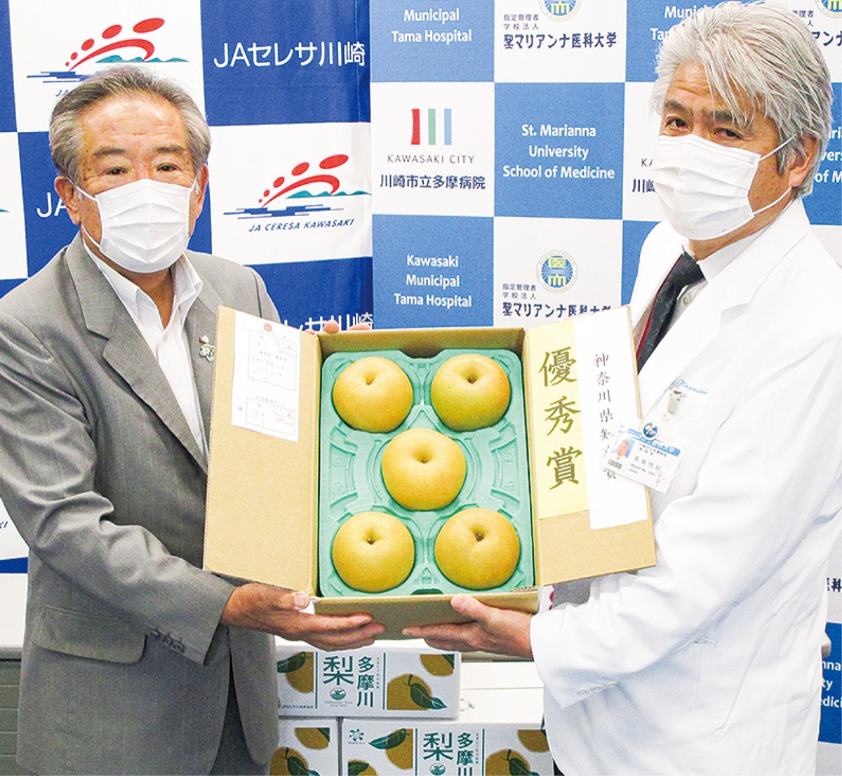 丹精込めて育てた農産物を届けて医療従事者を応援しようと、セレサ川崎農業協同組合(原修一組合長)と川崎市は8月18日、市立多摩病院(長島悟郎病院長)に川崎特産の多摩川梨295個とブドウ18房を寄贈した。