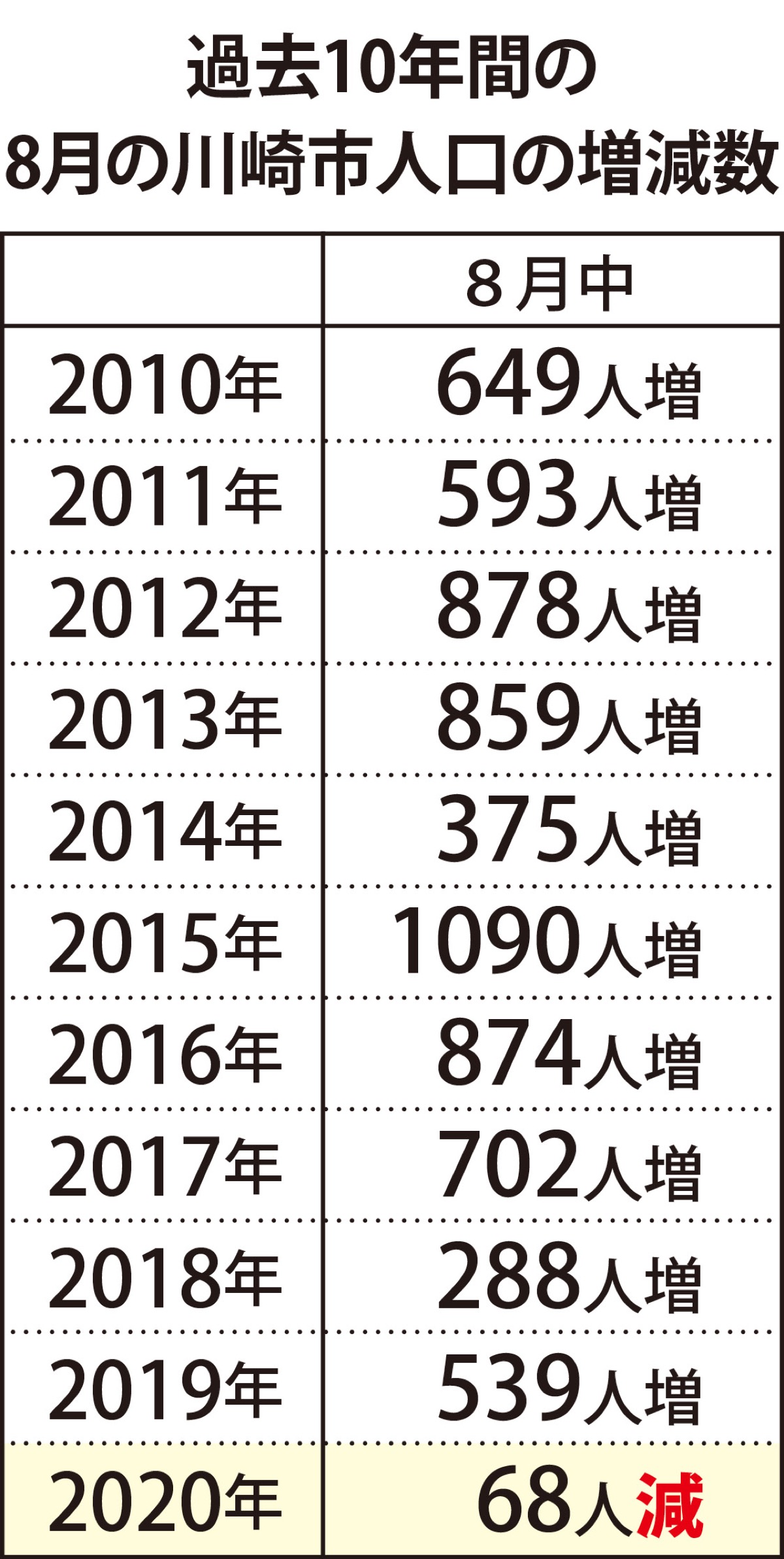 川崎市の人口が9月1日時点で先月と比べて68人減り、153万9522人となった。8月中に人口が減少したのは、過去10年間で初めて。