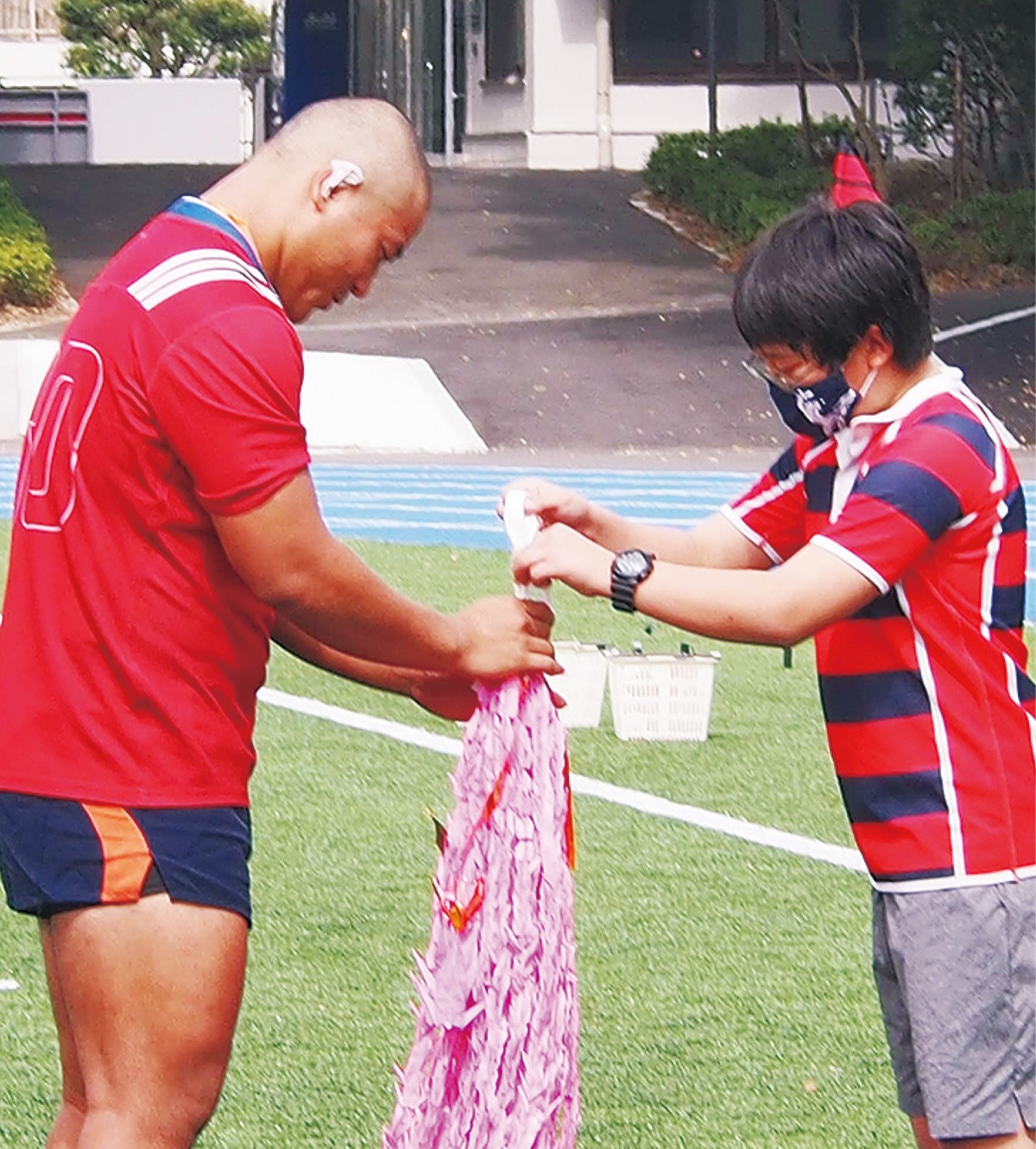 麻生ラグビースクール(杉浦輝明校長)が10月3日、関東大学ラグビーリーグ戦の開幕を控える日本大学ラグビー部「ハリケーンズ」を激励した。