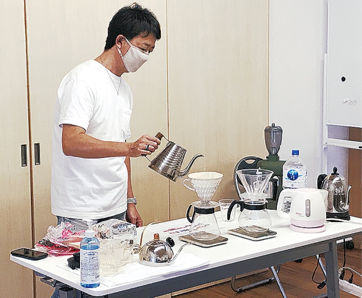 「どなたでもわかりやすいコーヒードリップ講座 初級編」と題し、焙煎工房MiLL(多摩区)の山崎晴久さんが講師を務める。「お客様の好みにあわせて焙煎してコーヒー豆を提供する」という山崎さんが丁寧に解説する。