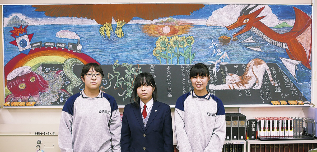 市立金程中学校の美術部3人が黒板に描いた作品が先月、全国大会「黒板アート甲子園」のジュニアの部で最優秀賞に輝いた。同校からの最優秀賞は2年連続。受賞作は「壁に掛けられた黒板が後ろに倒れたら…」と、生徒が日頃眺めている黒板の裏側に広がる世界を想像した。