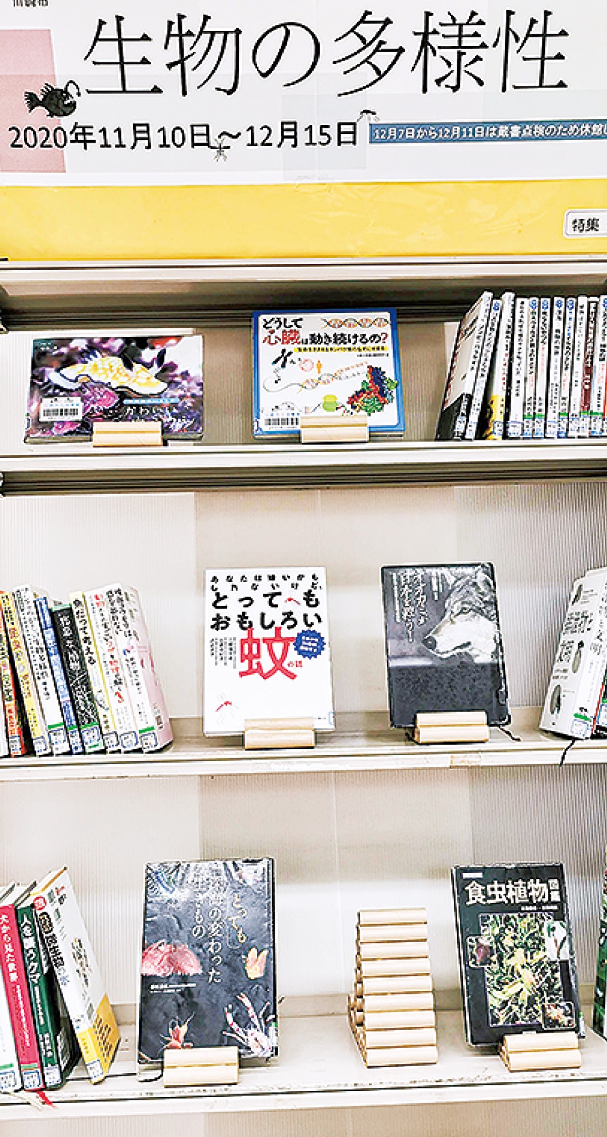 麻生図書館のテーマは「生物の多様性」。動植物が「生き延びよう」とする戦略を紹介する様々な本を並べる。「植物なら毒やトゲ、深海魚なら何を捕食するか…。大人向けの特集ですが、写真集などお子さんと一緒に楽しめる本もあります」と同館。展示数は約90作品(貸出中の場合あり)。展示は12月15日(火)まで。(問)同館【電話】044・951・1305