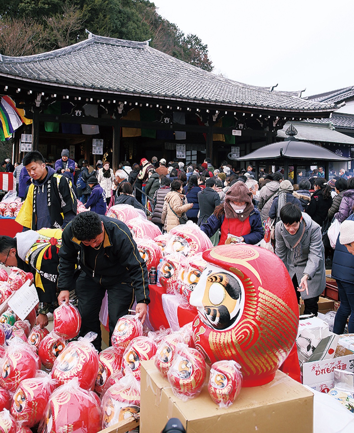 「ダルマ市」の原形は江戸、明治の頃から立つようになり、本堂が再建された50年ほど前から、現在のようなにぎわいを見せるようになった。多い年には5万人前後が来場。境内や周辺には、神奈川県内や関東のだるま販売店をはじめ、農機具や飲食の露店も並ぶ。