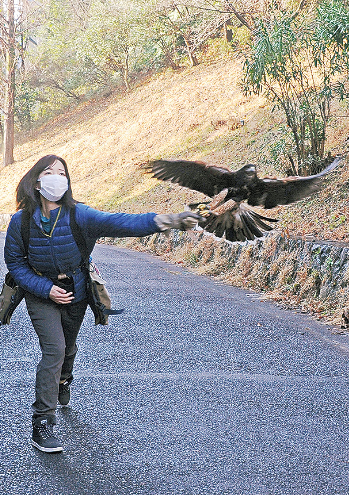 状況が変わったのは、新型コロナ感染防止のため、オンライン授業が続いた昨年の夏。学生がいないキャンパスには、カラスが我が物顔で歩く姿が見られ、同大では対策を再検討。学生が勉強する場所を考慮し、美観を汚すネットやワナの設置や忌避剤の散布などではなく、環境に負荷をかけない方法として、タカによる駆除が選ばれた。