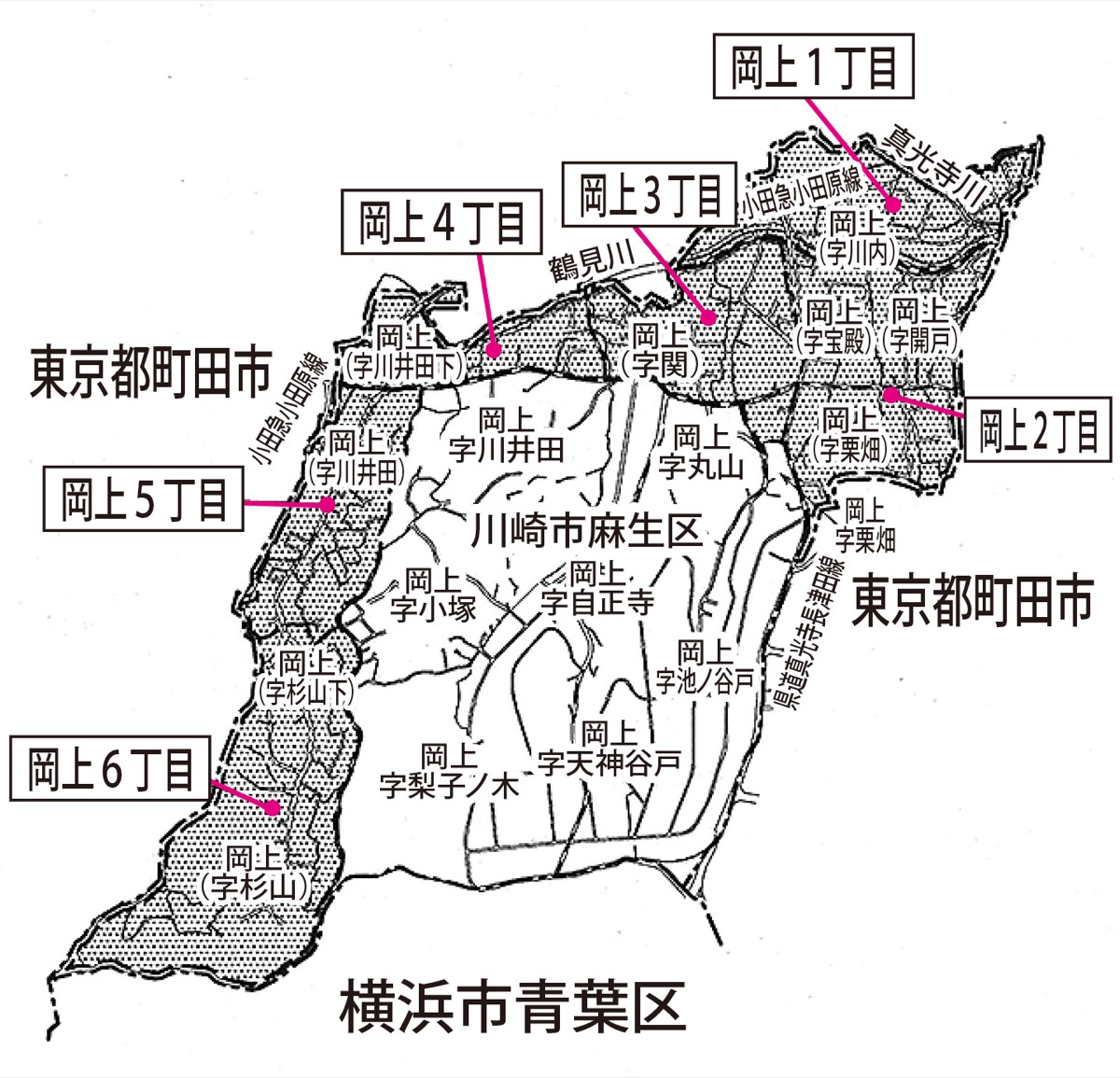 岡上小学校付近を含む市街化調整区域は農業振興地域が多く、住居数が少ないため、住所変更は行いませんが、それ以外の地域では令和3年11月から、1丁目から6丁目となります。これにより麻生区の住居表示実施率は約95%となり、川崎区と並びます。