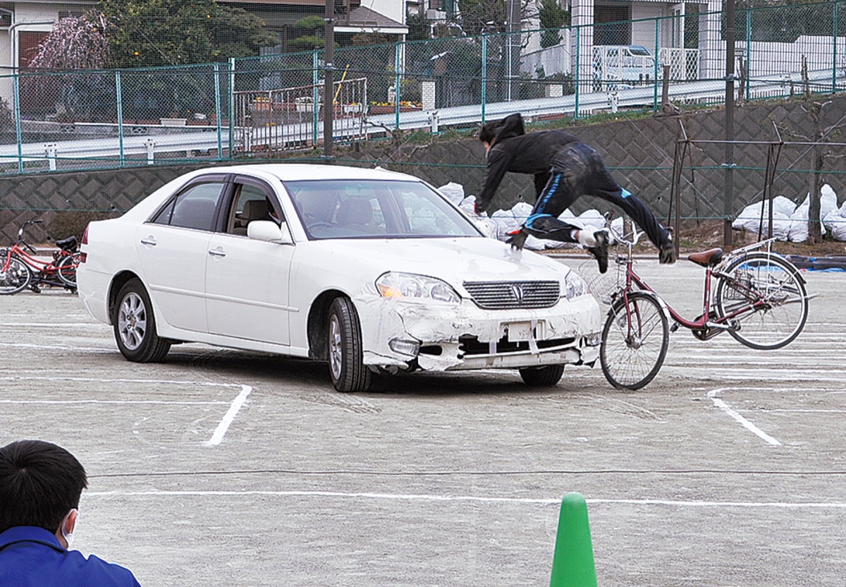 当日は、自転車の点検・整備のアドバイスが行われたほか、スタントマンによる自転車同士の衝突、時速40Kmで走る車と自転車の衝突などの事故が再現された。生徒たちはヘッドホンをした状態での車の接近、トラックの内輪差も体験した。息をのんで見守っていた生徒たちは「事故の恐ろしさを実感した」「ルールを守れていないだけでこんな大きな事故につながるので気を付けたい」と感想を話していた。