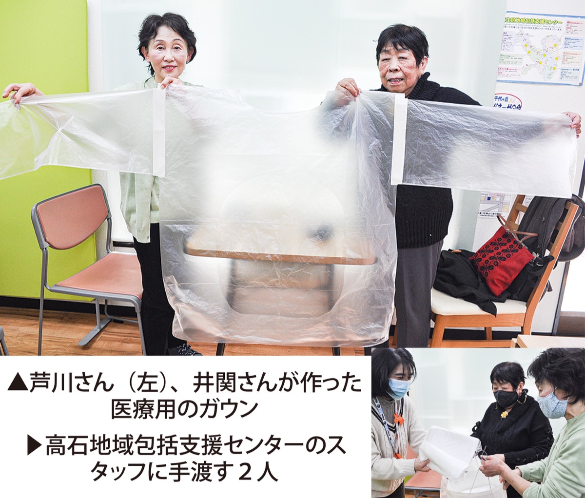 新型コロナの感染拡大に伴い、店頭からマスクが激減した昨春。高石地域包括支援センターは、マスクが必要な人と、作る人をつなげる「手作りマスクプロジェクト」を立ち上げた。そのプロジェクトに参加していた井関さんと芦川さん。井関さんが、かかりつけの歯科医院で、訪問診療の際に使うガウンが足りないという話を聞き、ガウンづくりに賛同してくれた芦川さんと昨年6月頃から2人でガウンづくりを始めた。