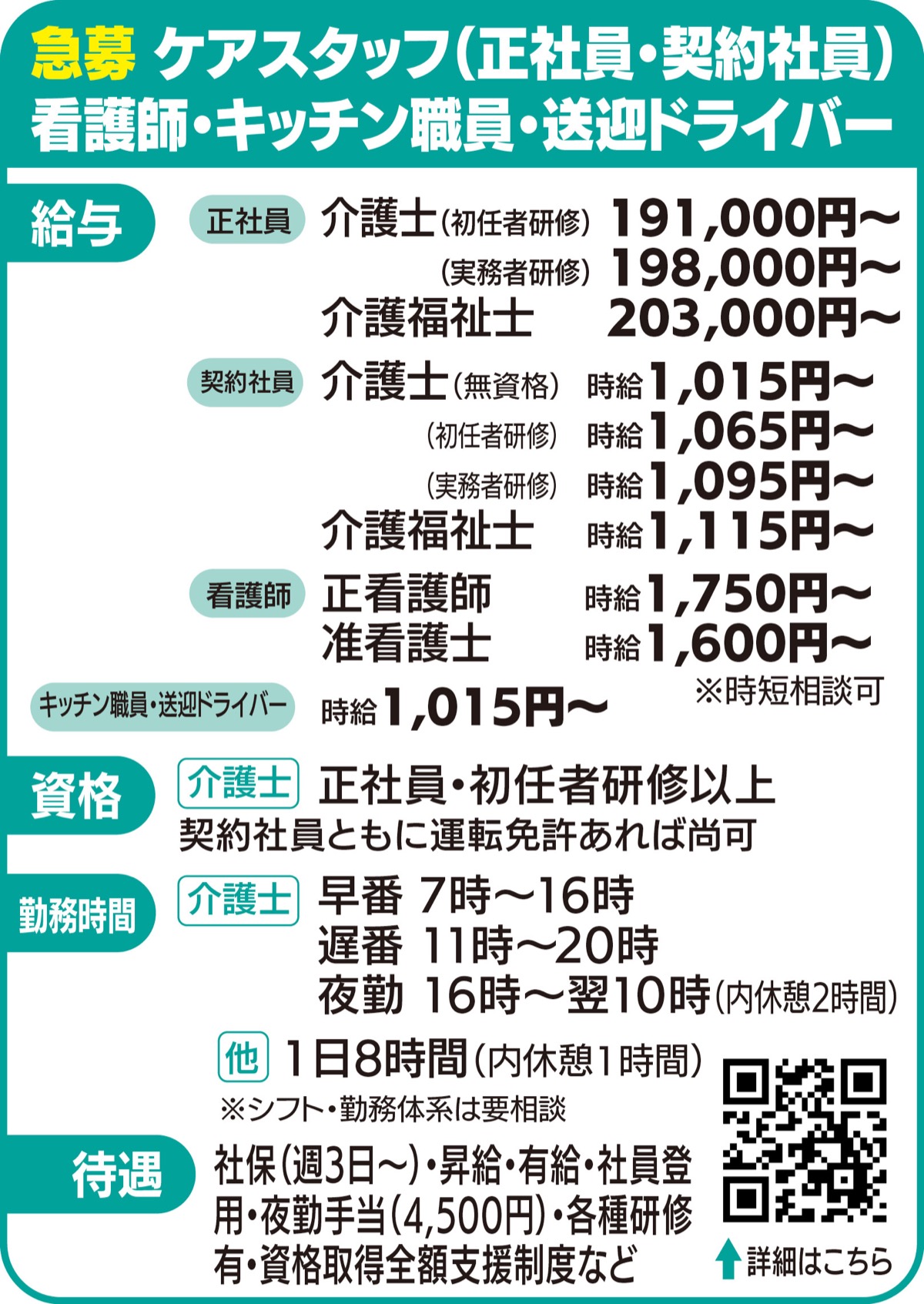 ニーズの高まりを受け、ケアスタッフや、看護師などを急募。正社員や契約社員など、希望に沿った働き方に応じているほか、資格取得制度などの手厚いサポート体制も魅力。「さまざまな経験を積めるのが、この仕事ならでは。コロナ対策も万全なので、一緒に働いてくれる方は、ぜひご相談、ご応募ください」と担当者は話す。