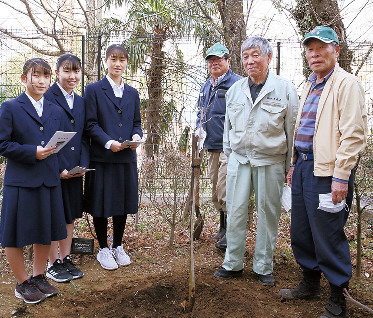 当日、飯草会長をはじめ、同会から参加した3人は全員が柿生中出身。同校生徒会の3人も加わり、先輩後輩で協力して正面玄関前の植え込みに苗木1本が植えられた。生徒会長の山口真央さん(2年)は「自分たちの代で禅寺丸柿が戻ってきてうれしい。育っていくのを見ていきたい」と笑顔を見せた。飯草会長は「早ければ2、3年で実がなる。生徒たちには卒業しても見に来てほしい」と語った。