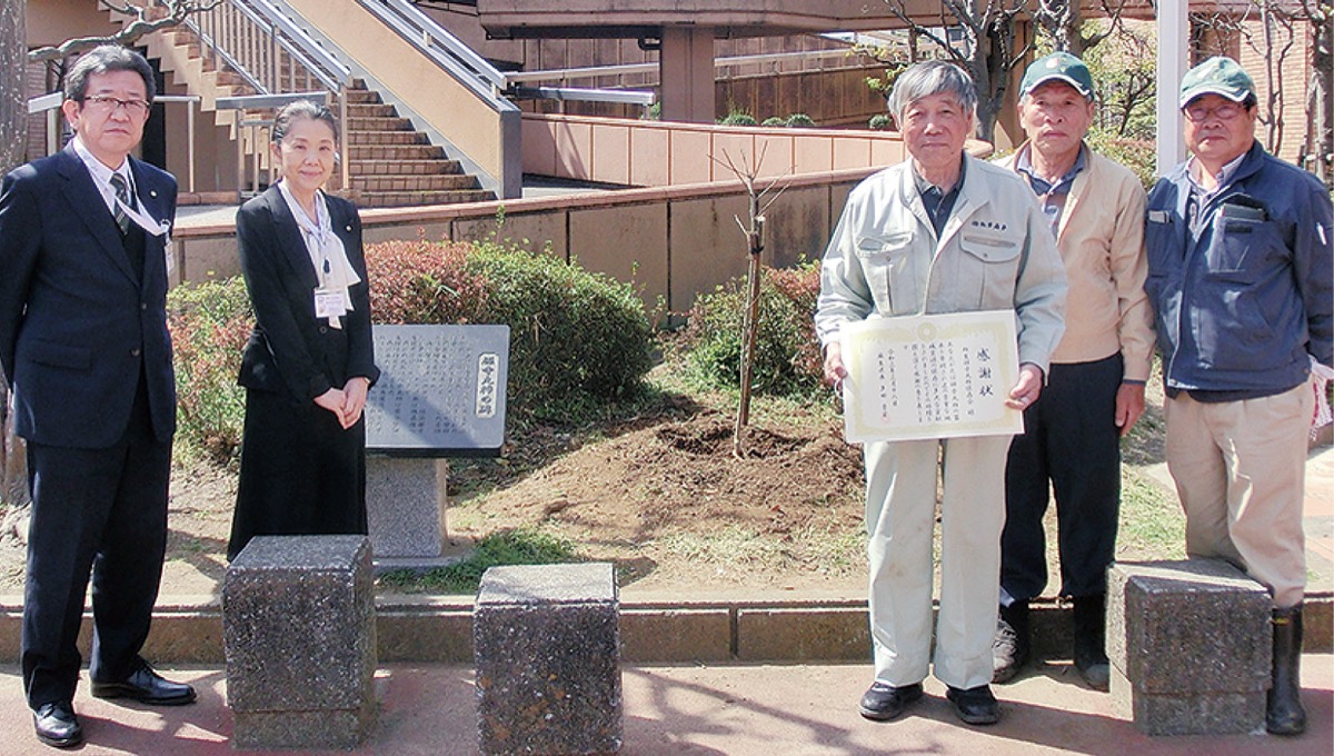 同日、一昨年に植えるも倒れたため木を撤去していた区役所広場にも、同会は新しく植樹。地域資源の保全に貢献したとして多田貴栄区長から同会に感謝状が渡された。
