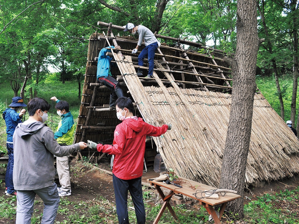 青葉区と町田市に隣接する区内岡上の「梨子ノ木特別保全緑地」で5月22日、23日の2日間、「週末ワークキャンプ」が開かれ、森の保全活動と、かやぶきの小屋作りが行われた。