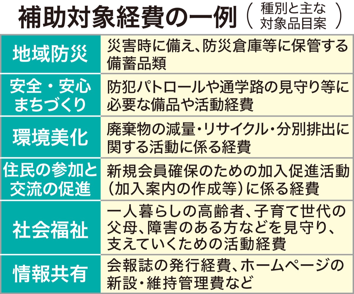 対象項目は地域防災や環境美化、情報共有などの事業活動。地域活動の課題解決や住民参加の機会を増やし、加入促進につなげることなどが主な目的。会館施設の維持管理費などの運営費は対象外となる。
