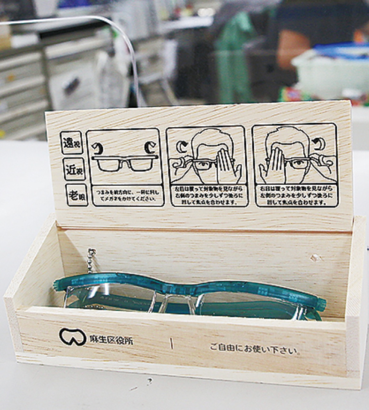 今回の寄贈に際し、老眼鏡を入れておくケースを特注。純国産の桐材を使用し、使い方のイラストや麻生区のシンボルマークが描かれている。デザインは、京都を拠点に活動し、イタリアやデンマーク企業とのプロジェクト実績もあるデザイナー・福定良佑氏が担当した。