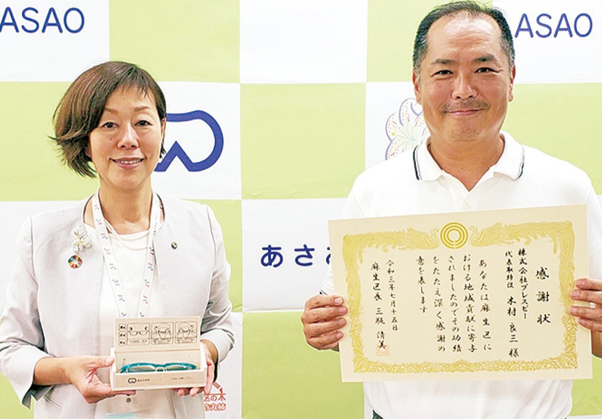 一般医療機器を販売する百合丘の(株)プレスビー(木村良三社長)が7月15日、同社の「度数調節メガネ™(老眼鏡)」を20個、麻生区役所に寄贈した。