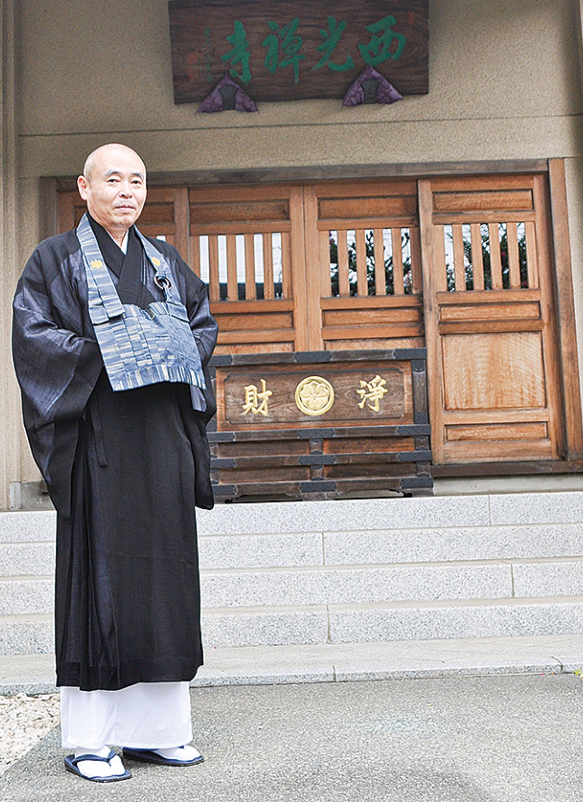 黒川の菩提所として1400年ごろに開創された「雲長山 西光寺」。戦時中、学童疎開の宿舎となっていた。19代目の山中聡英住職(57)は11年前から毎年、市立はるひ野中学校の総合学習の時間に、学童疎開のようすなどを紹介し、「平和とは何か」を生徒たちに問いかける授業を行っている。