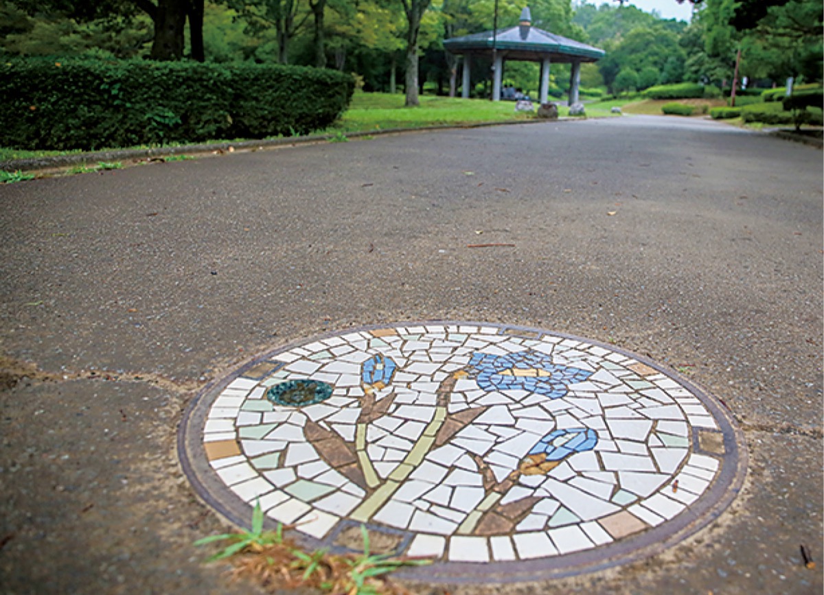 多摩丘陵の豊かな自然を生かし、水と緑をテーマに作られた同公園。公園入口の看板によると、マンホールのモザイク絵は、麻生区の自然と歴史にちなんだもの。地域の人たちの協力で完成した作品だという。