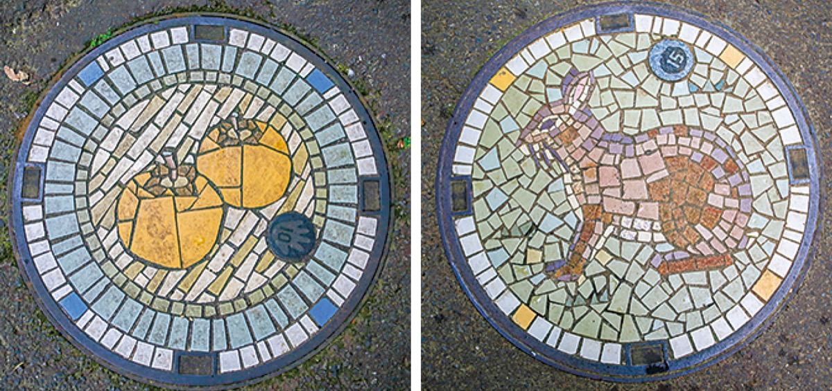 川崎市制60周年を記念して計画された、王禅寺ふるさと公園内を歩いていると目に留まるモザイク絵のマンホール。芝生の多目的広場を囲むように点在し、動物や昆虫、植物などが描かれているが、一つひとつ異なる絵柄だ。