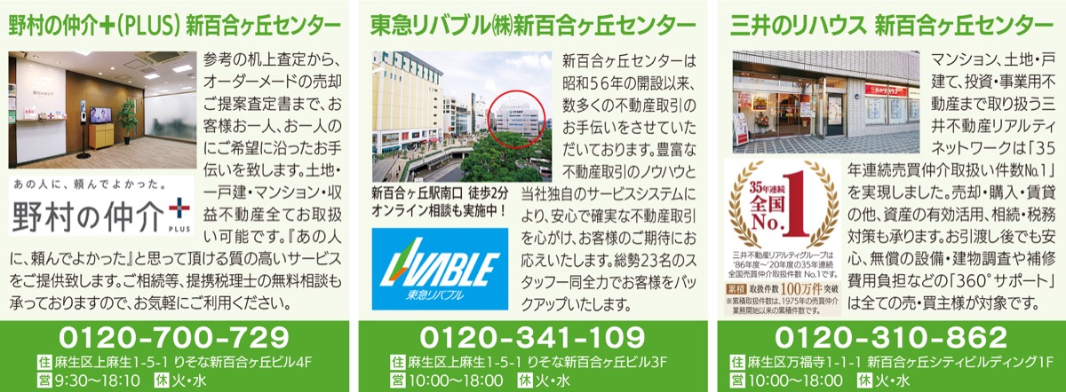 そこで本紙では秋の特別企画として、不動産大手の3社(東急リバブル、野村の仲介+、三井のリハウス※各新百合ヶ丘センター)と協力し不動産を無料で査定。本紙が取り次ぎ3社一括で依頼することで、自宅の資産価値を比較できるだけでなく、各社の視点で今後の住まいや不動産全般に関する相談も可能だ。まずは当編集室へお問合せを(下記参照)。
