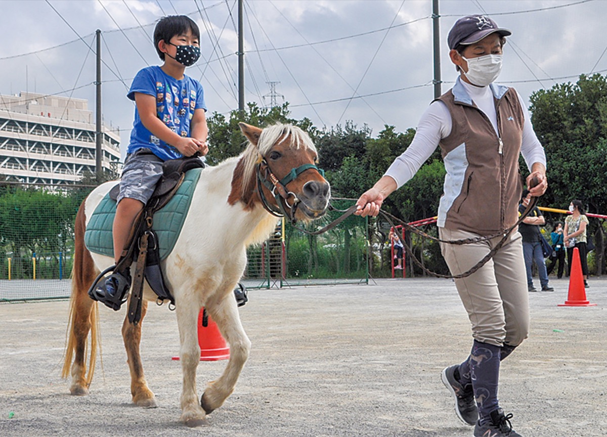 ポニーをなでたり、餌をあげるなどふれあった後、参加した1〜3年生の児童は乗馬を体験。3年生の女子児童2人は「ポニーに乗ったのは初めて。いっぱい揺れてびっくりした」「人参を食べるのが速くて驚いた」とポニーとのふれあいを楽しんだ。