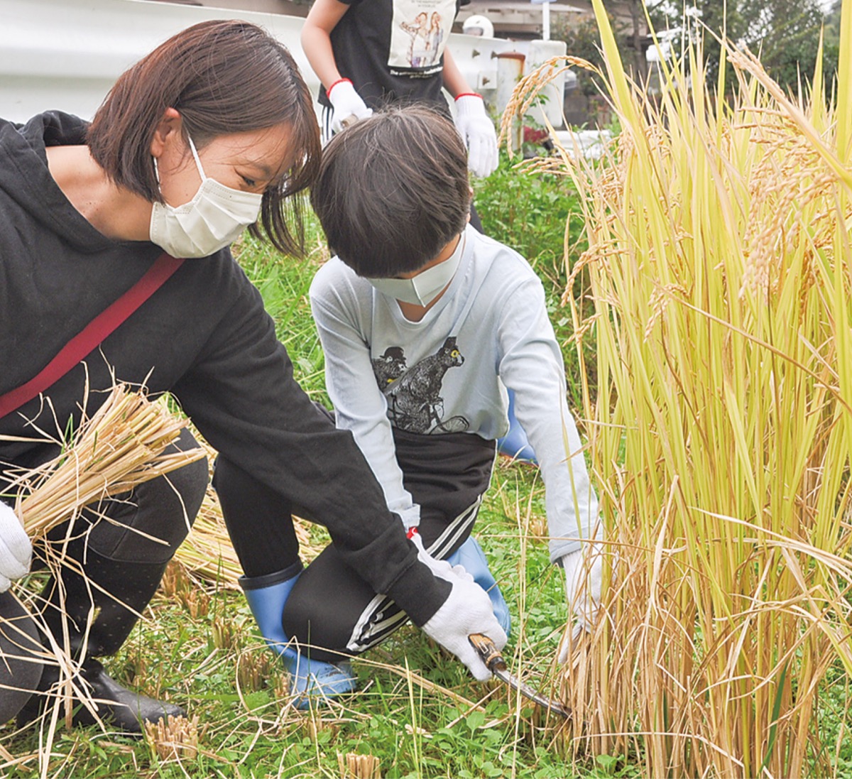 参加した岡上こども会の児童は「自分で植えたお米を収穫できてうれしい。食べるのが楽しみ」と収穫を喜んだ。片平在住で家族4人で参加した母親は「自分たちが食べるものを収穫できる機会は少ないので、喜んで参加した。麻生区はいろいろな体験ができて素晴らしい環境」と体験を振り返った。