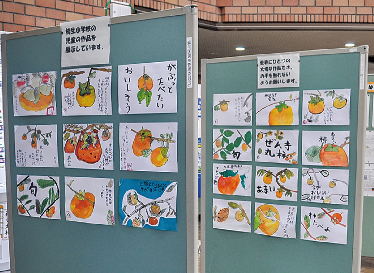 今回、その記念日にちなみ、区民に地元の名産である禅寺丸柿を知ってもらおうと、10月14日から区役所でパネル展示を実施。禅寺丸柿の歴史や、柿生中央商店会が主催する禅寺丸柿まつり内で、公募の中から選ばれたキャラクター「かきまるくん」の紹介、市立柿生小学校の3年生が描いた「柿」の絵50点が展示されている。