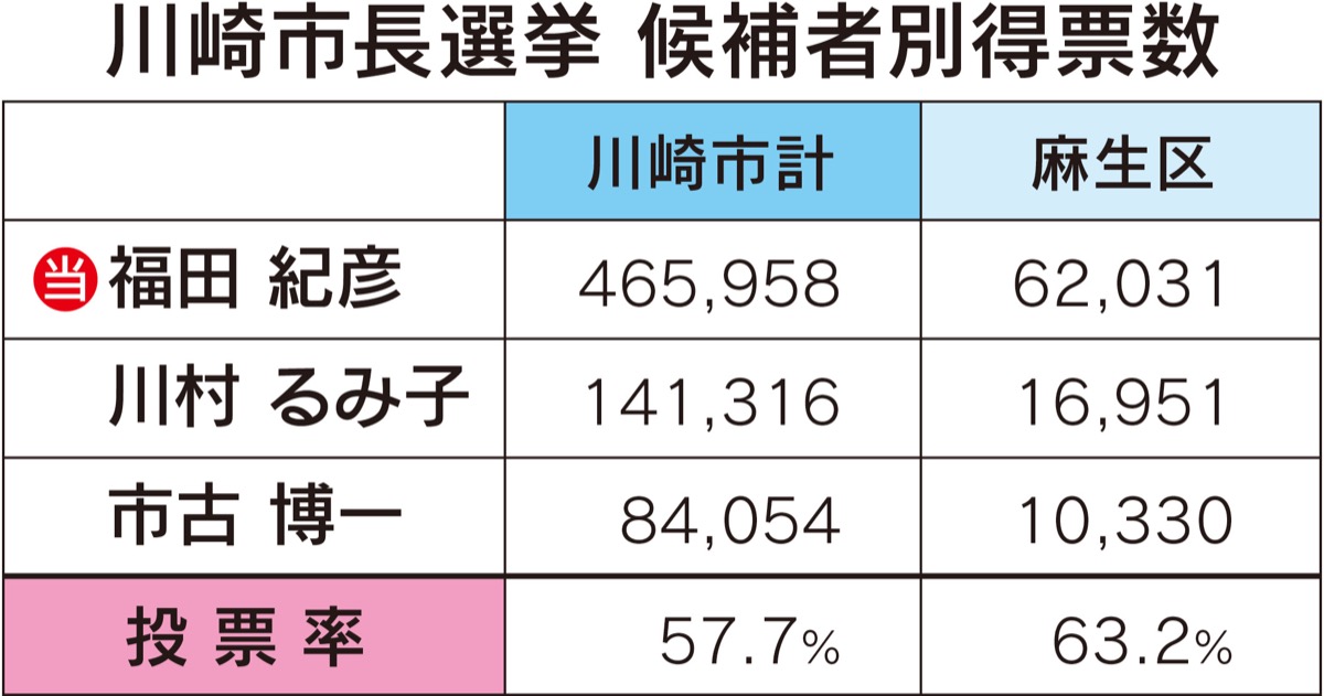 任期満了に伴う川崎市長選挙が10月31日に投開票され、無所属で現職の福田紀彦氏(49)が、いずれも無所属新人の川村るみ子氏(42)と市古博一氏(73)を破り、3選を果たした。得票数は前回比約6万票増の46万票超で、歴代最多となった。前回同様、衆院選と同日選となった今回の投票率は57・7%で、前回比5・4ポイント増だった。