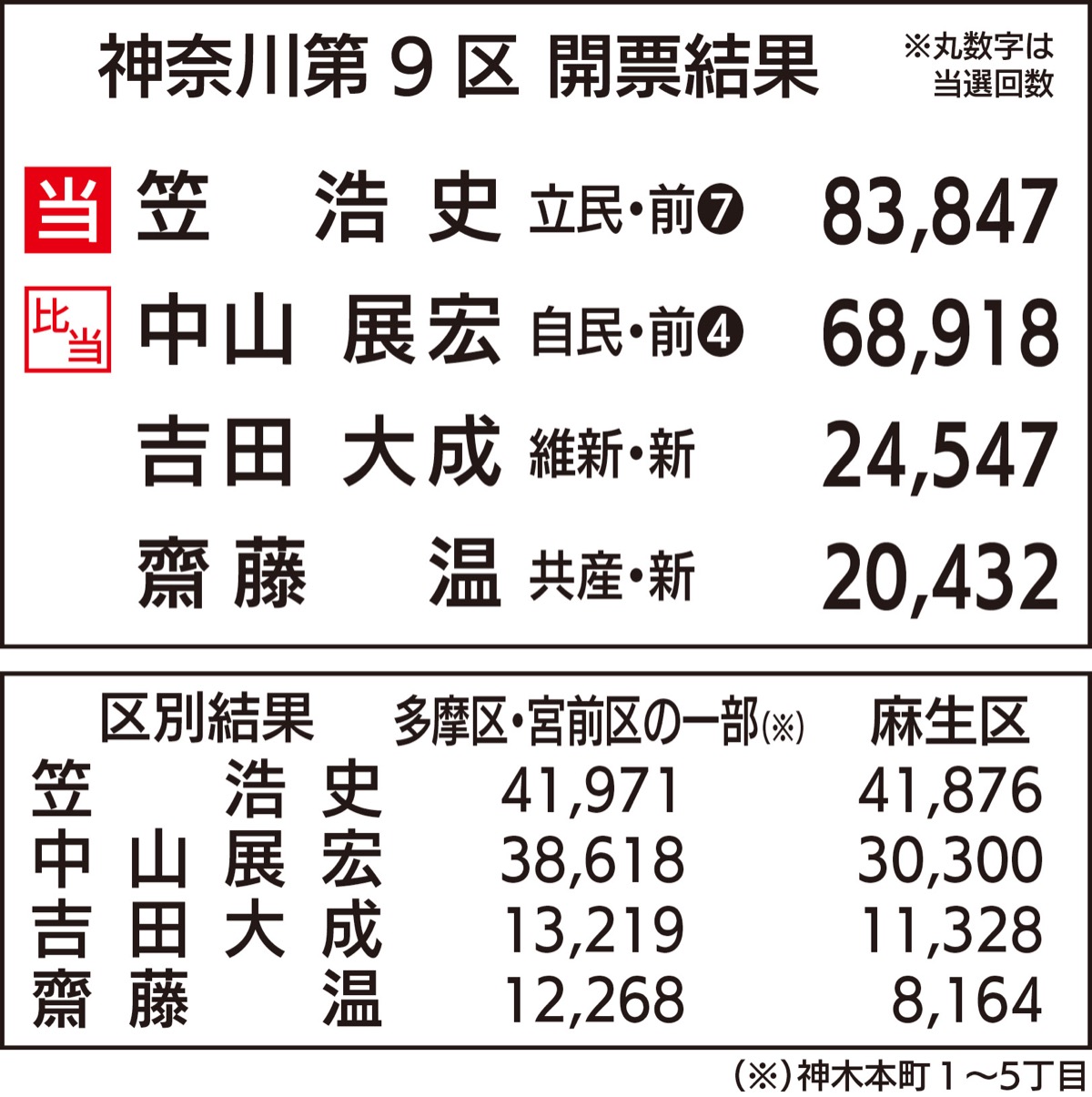 衆議院議員選挙の投開票が10月31日に行われ、前職と新人の4人が立候補した神奈川9区(麻生区、多摩区、宮前区の一部)は立憲民主党の前職・笠浩史氏(56)が8万3千票超を獲得し7選。前回僅差だった自民党の前職・中山展宏氏(53)は約1万5千票差で敗れ、比例代表で4度目の復活当選となった。