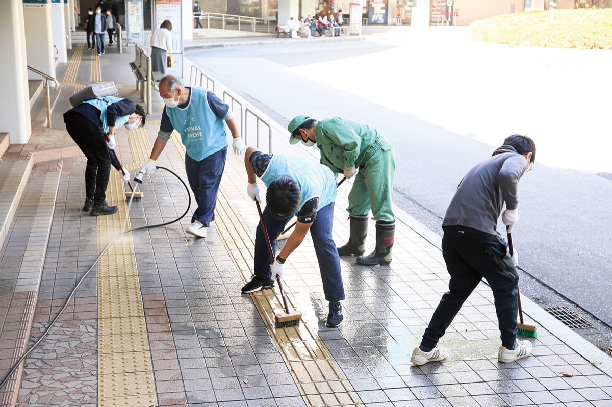 新百合ヶ丘駅南口広場で10月30日、地元企業などから約90人が参加し「新百合ヶ丘駅南口クリーンアップ大作戦」と題してデッキ清掃などを行った。今年で3年目となるこの取り組み。特にこの1年、コロナ禍で外飲みによるごみのポイ捨てが増え、ハトの糞害も続くなど課題が多い中で、地域一体となった美化活動が進められている。