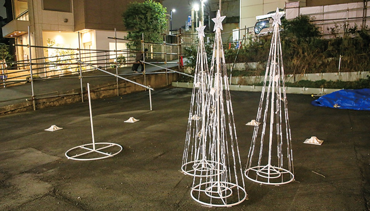 会場は、同駅南口前のタクシー乗り場の奥、「日高屋柿生駅前店」向かいの空き地。明かりがついたツリーや雪だるまの飾りが並び、電源は商店会所有の街灯から取り込んでいる。期間は12月25日(土)までを予定する。