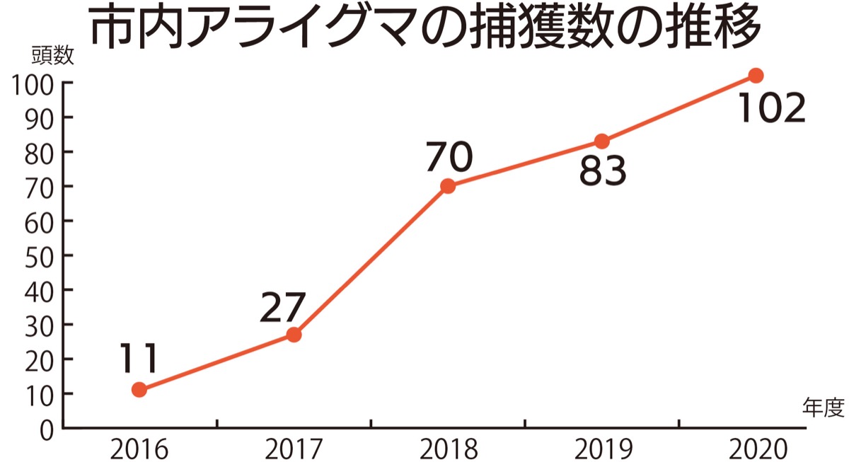 アライグマはペットとしてアメリカから輸入され、捨てられたり逃げ出したりして野生化、山奥から都会までどんな場所でも生活できるため、全国的に生息範囲が広がった。市動物愛護センターによると、市内では1998年頃から生活被害が報告されているという。市は神奈川県が2016年に策定した「第3次神奈川県アライグマ防除実施計画」に基づき、積極的に捕獲を推進。その結果、16年度に11頭だった捕獲数は、20年度には102頭(麻生区45頭・多摩区23頭・高津区17頭・宮前区14頭・川崎区2頭・中原区1頭)まで増加した。