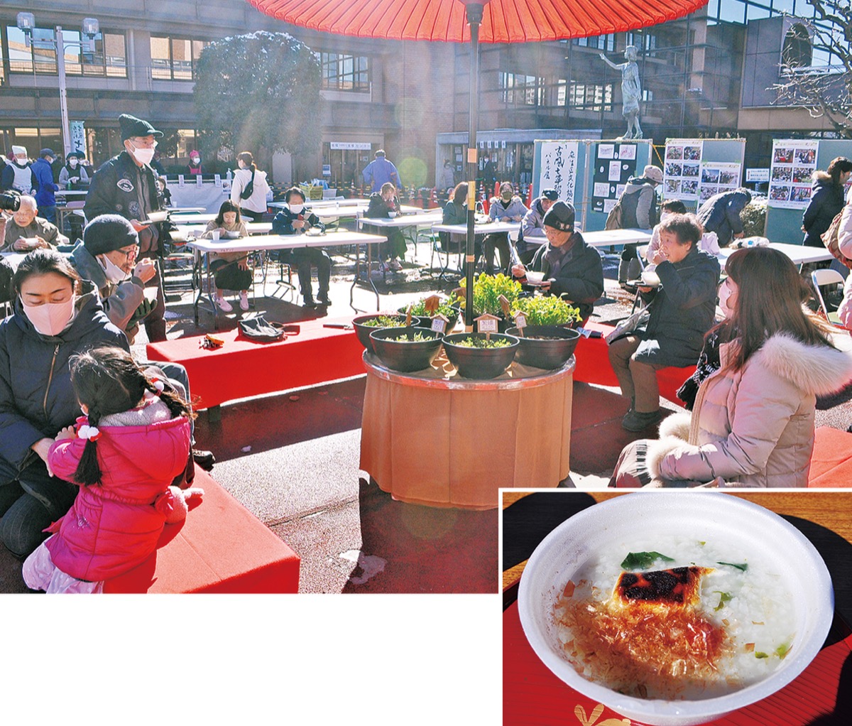 新年恒例の「あさお古風七草粥の会」が1月7日、麻生区役所前広場で開催され、無病息災を願い、500食の七草粥が振る舞われた。