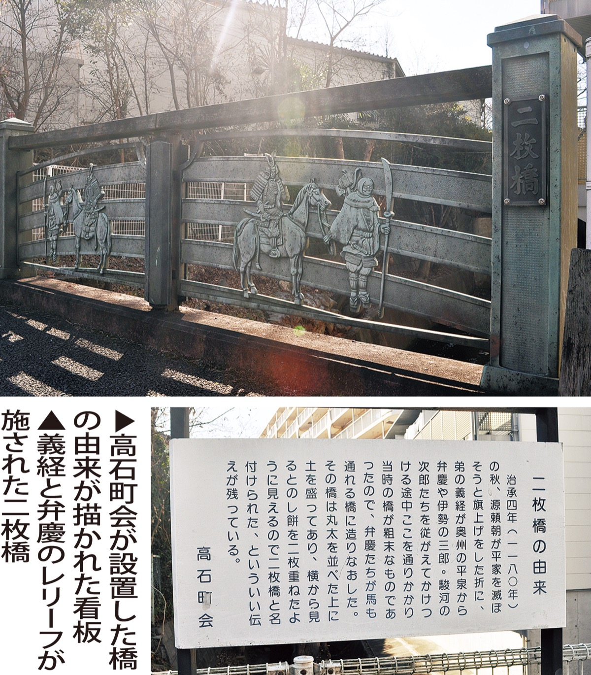 この橋は、義経一行が多摩区の寿福寺を過ぎ、高石から五反田川の橋を渡ろうとするも、橋が粗末だったため渡ることができず、弁慶たちが丸太を使って橋を架け直したとされる。丸太の上に土を盛ったその橋が、横から見るとのし餅を2枚に重ねたように見えたことから「二枚橋」と名付けられたという。