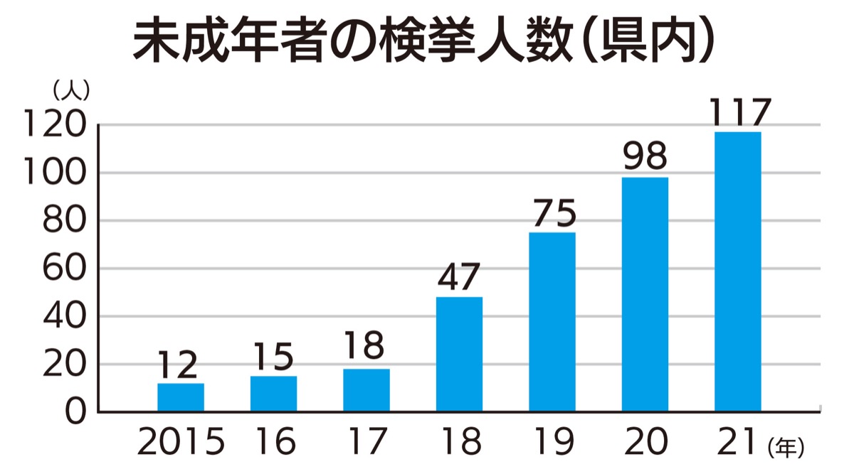 大麻所持などで検挙された県内の未成年者は2017年までは15件前後で推移していたが、18年に47件と急増。昨年は117件だった。覚せい剤やその他薬物は横ばいだが、大麻だけが増え続けている。