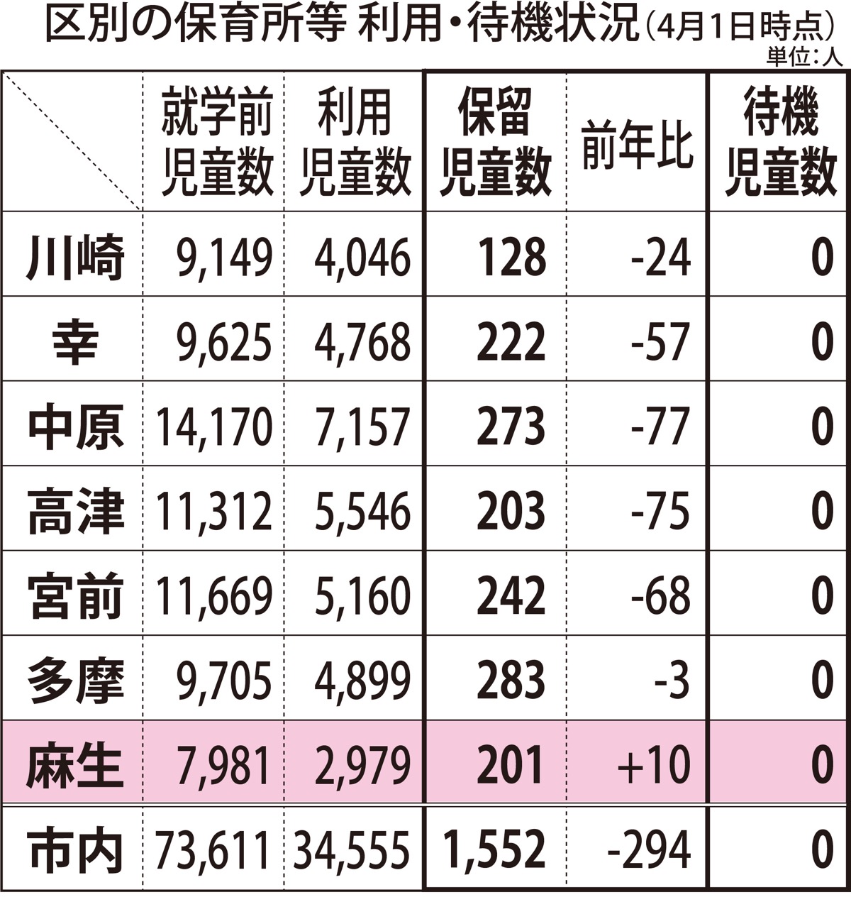市内の4月の保留児童数は、2960人だった2018年以降は減少傾向が続き約半数に。利用児童数が多い中原区や高津区では今年、70人以上減った。麻生区の保留児童は201人で、市内7区のうち2番目に少なかった。就学前児童数に対する利用割合は37・3%だった。
