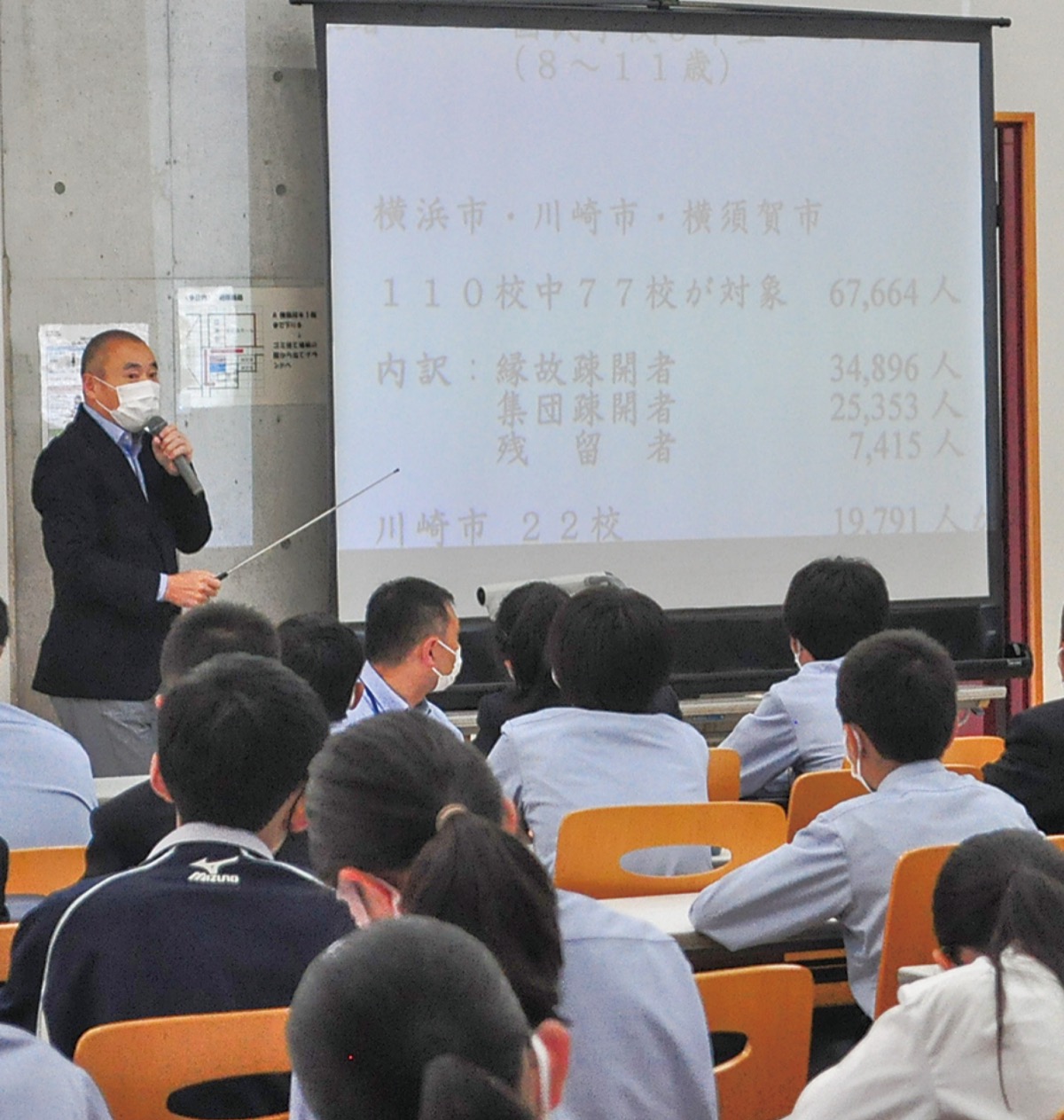 山中さんの講話では、学童疎開についての説明から始まり、麻生区(当時の柿生村)の6寺で150人の児童を受け入れていたことなどを資料を使って解説。西光寺では本堂に寝泊まりし、授業は行わずに掃除や遊んで生活していたこと、当時の食事や地元の人たちの生活、黒川に照空隊の基地があったことなどを紹介しながら、ロシアによるウクライナ侵攻についても言及。山中さんは「戦争をしないために、学び、意見を交わすことが大事。倫理観を持った大人になってほしい」と平和の尊さを訴えた。