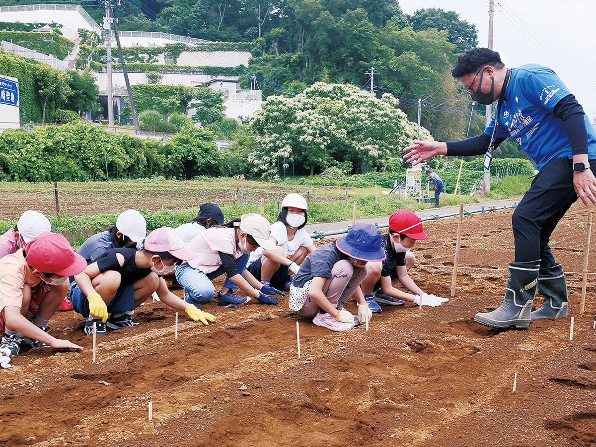 種まきで使用したのは津久井在来大豆。35人の児童は同社社員から土を掘る深さや植える間隔について説明を聞きながら、耕された土の中に、一人15〜20粒の大豆をそれぞれ植えた。