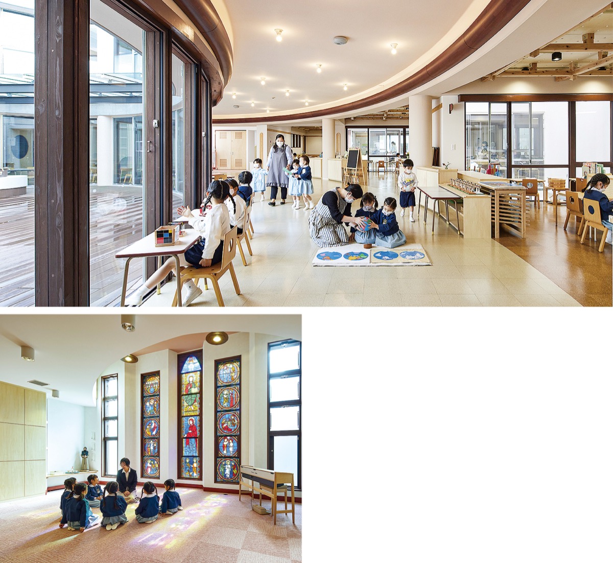 創立60周年を迎えたカリタス幼稚園(多摩区中野島)の新園舎が完成し、今春から園児が元気に通っている。ステンドグラスがきれいな「神さまのお部屋」や十字架が掲げられた中庭、来月完成予定の「カリタスの森」など、子どもたちが健やかに育つ環境。明るく広々としたオープンスペースでつながる保育室には、同園の特長「モンテッソーリ教育」にふさわしい教具がそろっている。