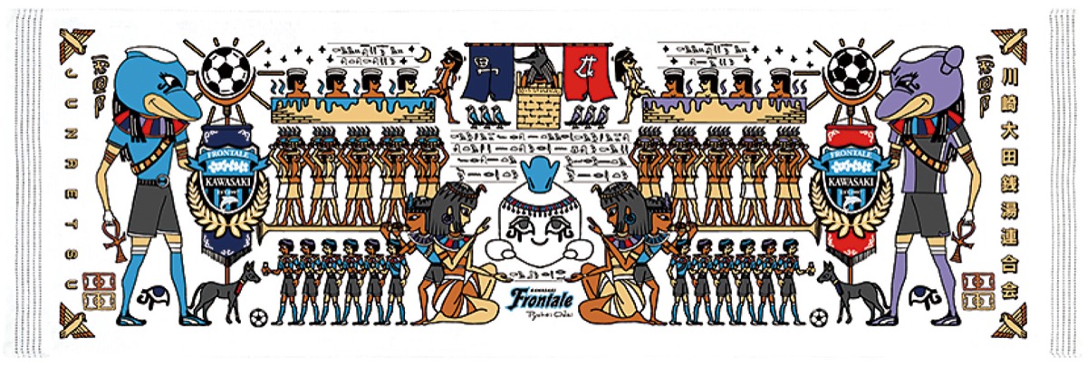 小田井さんは、ふろん太を「水の神」、ワルンタを「火の神」という「古代エジプトの神」に仕立て、手ぬぐいの両サイドに描いた。両者は天上界で仲が悪く、争いが起きると水が熱せられ、そのお湯が空から地上に降り注ぎ、地上の人がそれを銭湯のように浴びて健康になったというシナリオ。タオルの真ん中に描かれたカブレラは万能の神で両者の仲裁役。その時の戦いの模様をサッカーという競技でまつりとして今もやっている様子をデザインした。「選手が人々の下に描かれているのは、選手よりサポーターが上というフロンターレの気質」と小田井さんは解説する。また、川崎大田銭湯連合会などの文字を古代エジプト文字で表記するといった工夫も凝らし「ぜひ、解読してもらえれば」とも語った。