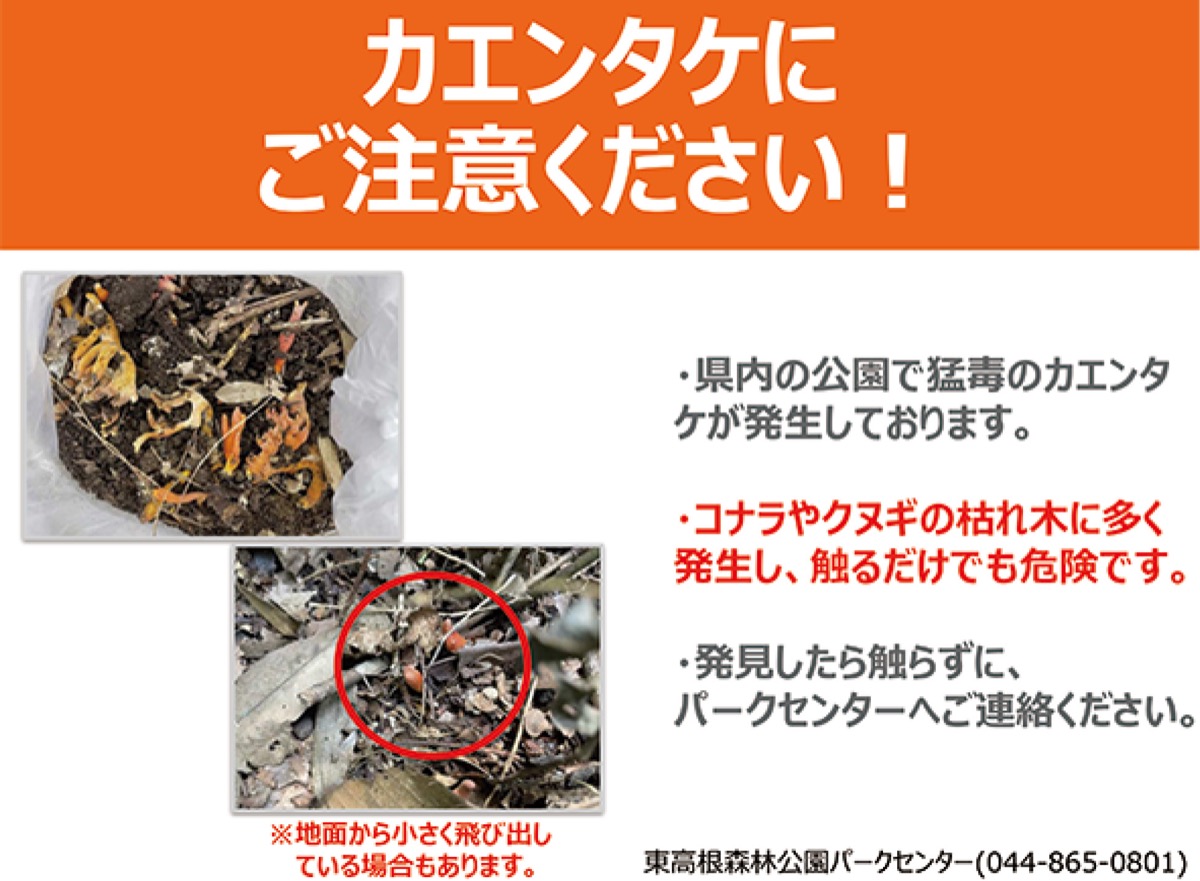 カエンタケはカシノナガキクイムシによるコナラやクヌギなどの伝染病「ナラ枯れ」が起きた樹林で確認されることが多い。県立東高根森林公園(宮前区)ではピクニック広場などにナラ枯れした樹木が多数あり、県が配布しているチラシを8月2日から掲示して注意喚起。担当者は「もしカエンタケを発見したら絶対に触れないで。撤去するためパークセンターに連絡を」と注意を呼びかけている。