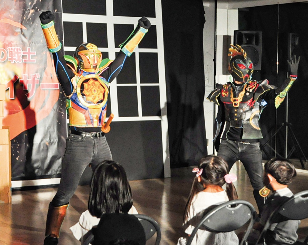 「柿生を愛し、柿生の平和を守るヒーロー」カキライザーのショーが8月20日、午前と午後の2回、下麻生のbless4スタジオで開催された。近隣に住む子どもたちと保護者、延べ60人がカキライザーの活躍を見に訪れた。