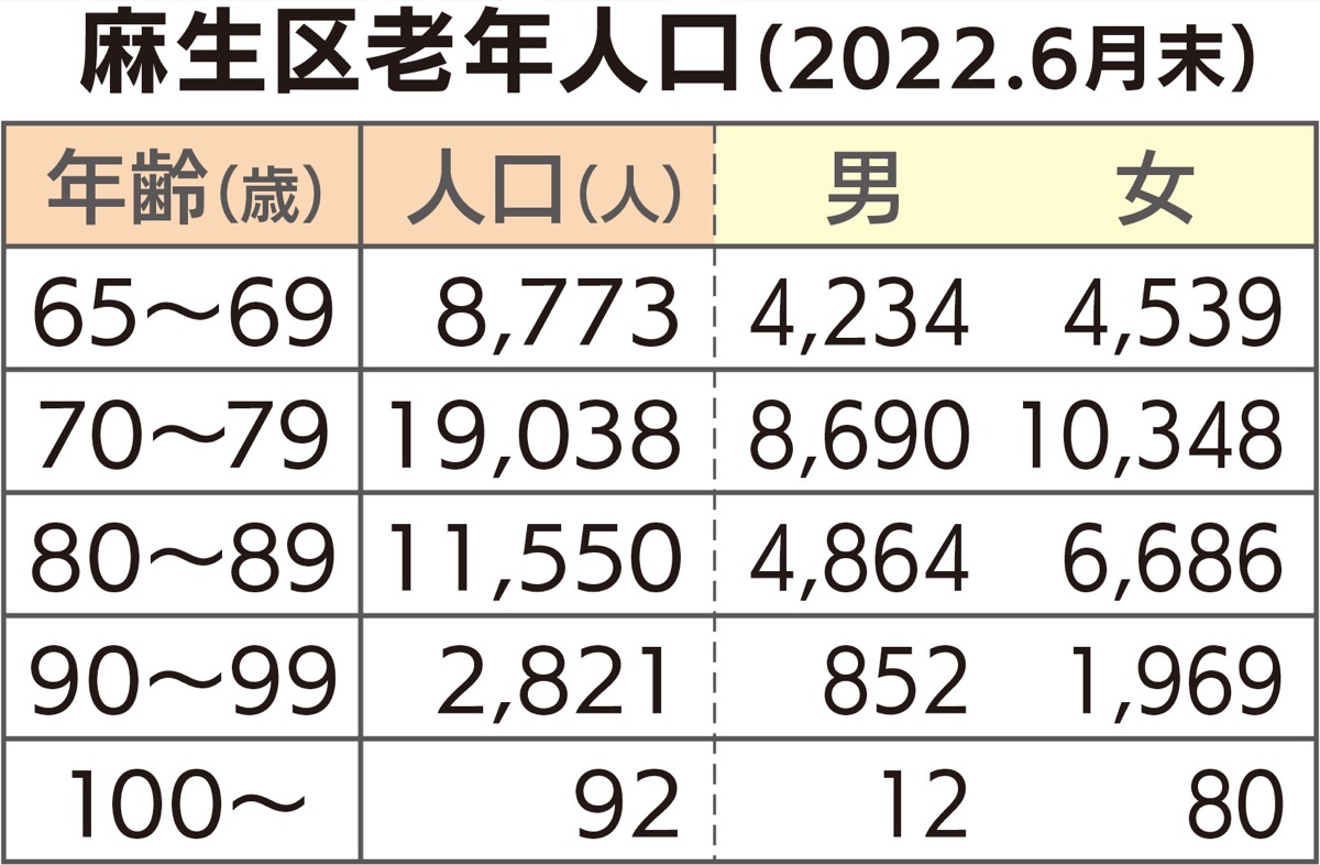 9月19日は、長年にわたり社会に貢献してきた老人を敬愛し、長寿を祝う、敬老の日。川崎市が住民基本台帳をもとにした人口集計によると、6月末時点で、麻生区内の老年人口(65歳以上)は4万2274人。区内総人口17万8694人に対し23・7%で市内7区で最も高い割合だった。