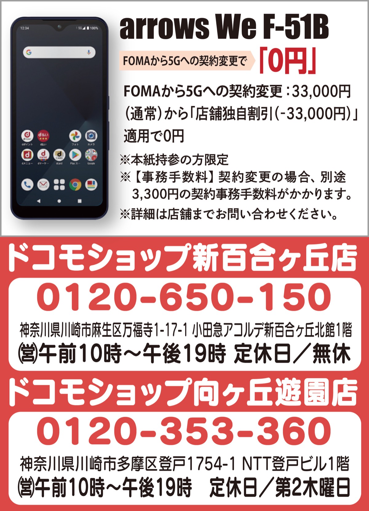 スマホの普及が進んでいる今、携帯電話各社では昨年より折りたたみケータイ(ガラケー)で使っている3G回線を順次終了中。これを受けドコモショップではスマホへの切り替え相談を実施している。無料のスマホ教室も開催中。オンラインショッピングやLINEなどのコミュニケーションツールの使い方もわかりやすく教えてくれる。さらに本紙を持参すると人気のスマホ「arrowsWe F-51B」が0円になるお得なチャンス。スマホデビューを考えている人は、お気軽に店頭へ。