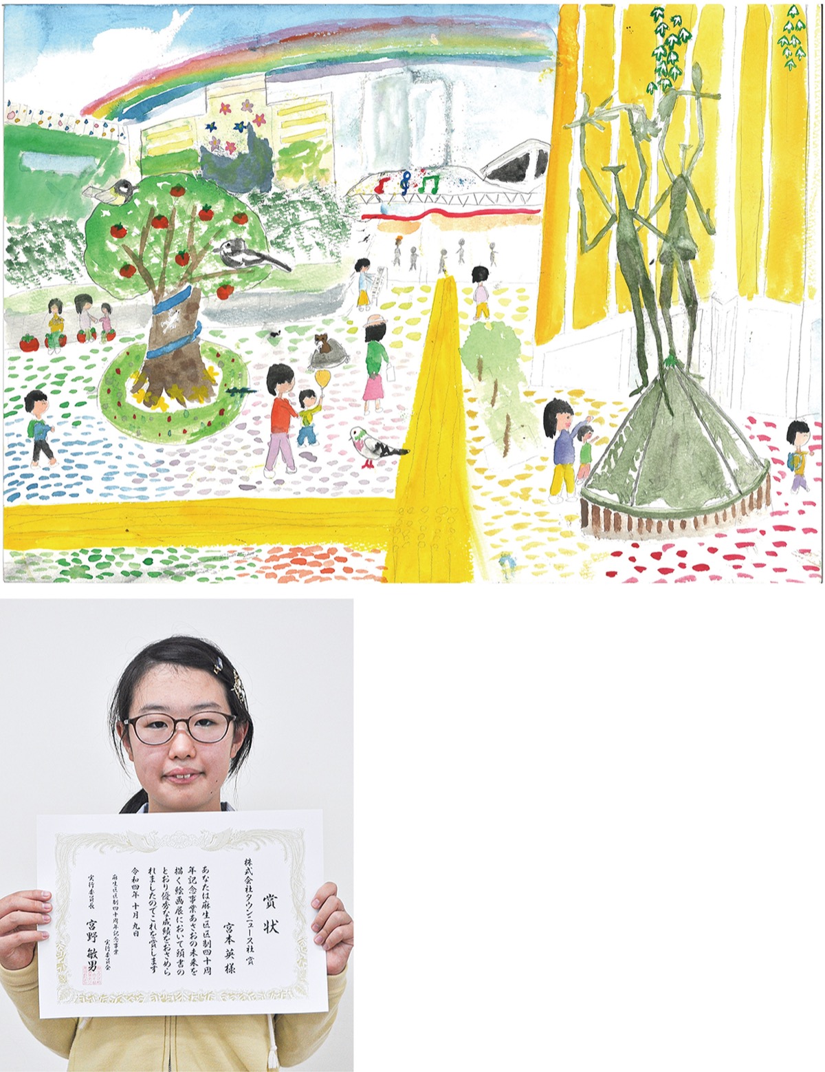 「(株)タウンニュース社賞」には、市立片平小学校6年生・宮本英さん(12)の作品「禅寺丸柿の噴水のある新百合ヶ丘」が輝いた。選出理由は「昔からある禅寺丸柿が未来の麻生区でも親しまれている様子が描けていて面白いから」。