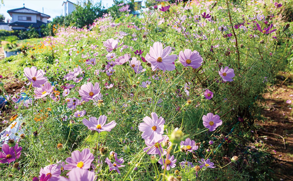 漢字で「秋桜」と表現されるように、秋に花を咲かせるコスモス。東百合丘の「ヒサマツ自然農法の会」の畑では、見ごろを迎えたピンクや白の花が一面に咲いている。