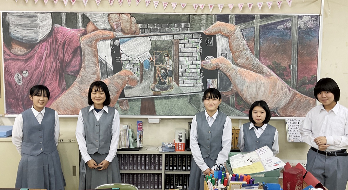 同校の受賞作品『パシャッ!!!!』は、美術部の2年生、岩貝星吾さん、代田莉奈さん、藤岡瑞月さん、森本花怜さん、山崎咲良さんの5人によるチームが手がけた。「中学生らしさ」をテーマに設定し、放課後にスマートフォンで遠近法を使った写真を撮る美術部員の様子を表現。夏休みの間に、図書室の黒板全面に描いた。