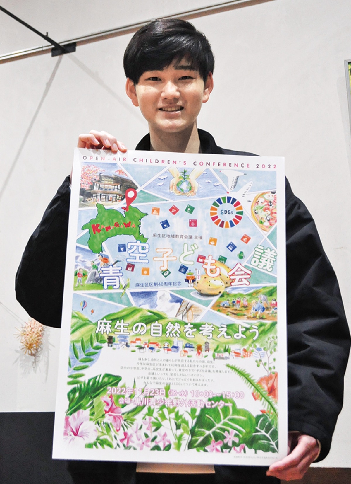 川崎市黒川青少年野外活動センターで11月23日に行われた「青空子ども会議」(麻生区地域教育会議主催)。同会議のポスターを制作したのが、桐光学園高校(栗木)3年生の松浦海斗さん=横浜市青葉区在住=だ。