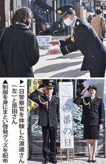 1月10日は「110番の日」――。麻生警察署(吉田善成署長)は同日、新百合ヶ丘駅南口ペデストリアンデッキで、110番の適正利用を呼び掛けるキャンペーンを実施した。野村證券(株)新百合ヶ丘支店の渡邊和貴さん(29)と原田実智子さん(28)が一日警察官として啓発活動に参加した。