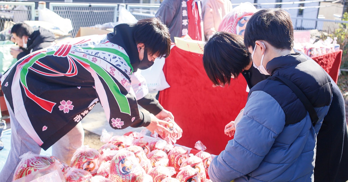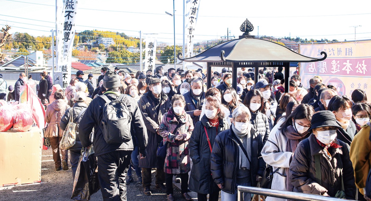 当日、同院周辺の道路は交通規制が行われ、お好み焼きやフルーツ飴、射的などの屋台が並んだ。出店数は、感染対策で制限された昨年よりも多かったという。境内では、参拝者が家内安全や無病息災を祈り、穴あき銭やだるまを求めた。だるまの購入者には「よよよい、よよよい、よよよいよい」の掛け声とともに火打ち石が鳴らされた。販売店の男性は「今年は午前中から売れ行きがよい」と話していた。